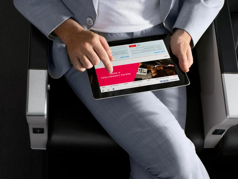 À bord de nos avions équipés du Wi-Fi*, restez connecté avec vos proches, accédez à vos e-mails ou poursuivez votre travail en vol. Choisissez le pass qui vous convient pour vous connecter à internet directement depuis votre smartphone, tablette ou ordinateur.